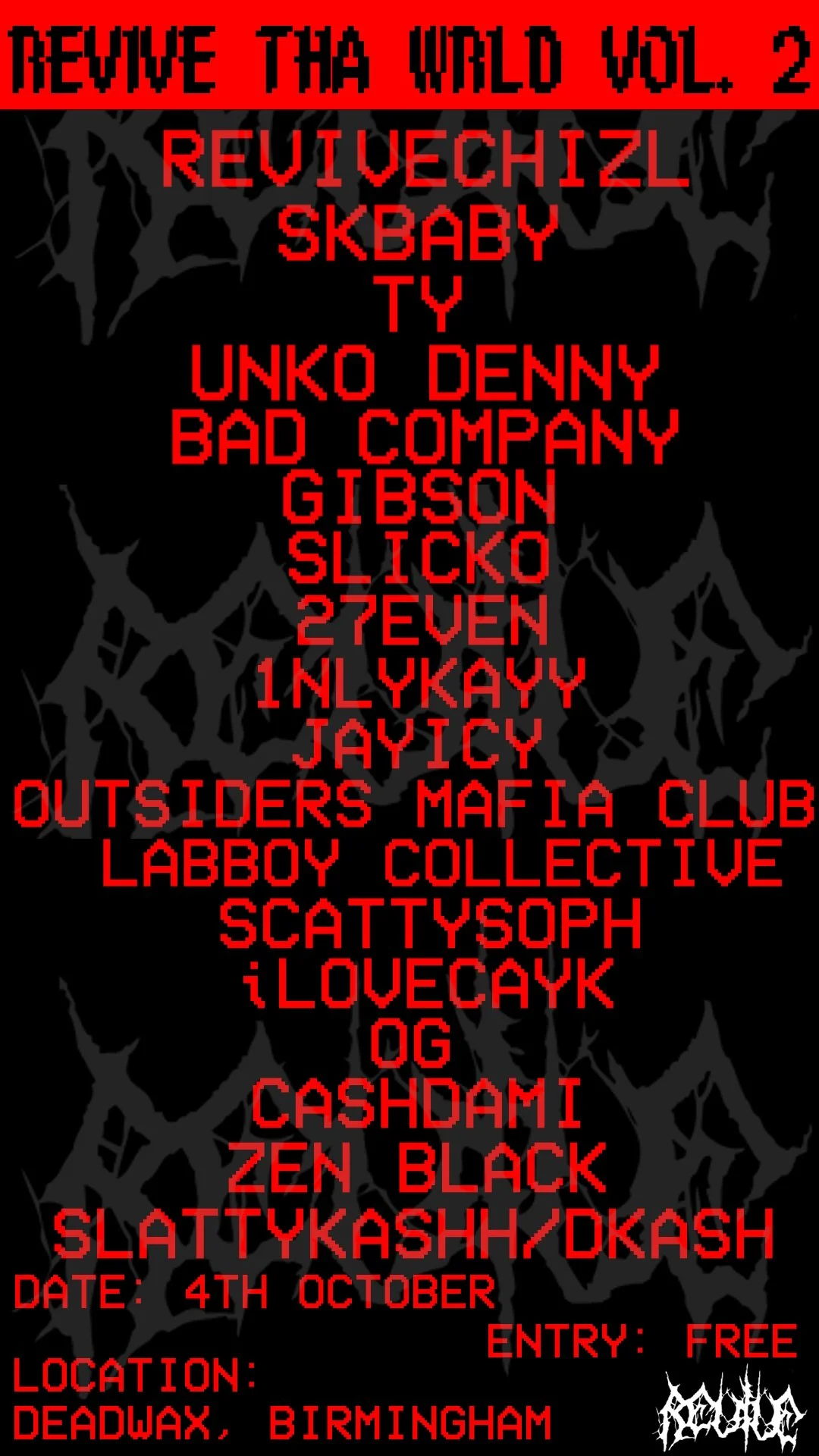 After the success of our debut show, REVIVE THA WRLD VOL. 2 returned to Deadwax with an even bigger lineup and energy. Hosted by REVIVECHIZL, this event brought together a wide range of underground artists, supported by the REVIVE team and close collaborators.